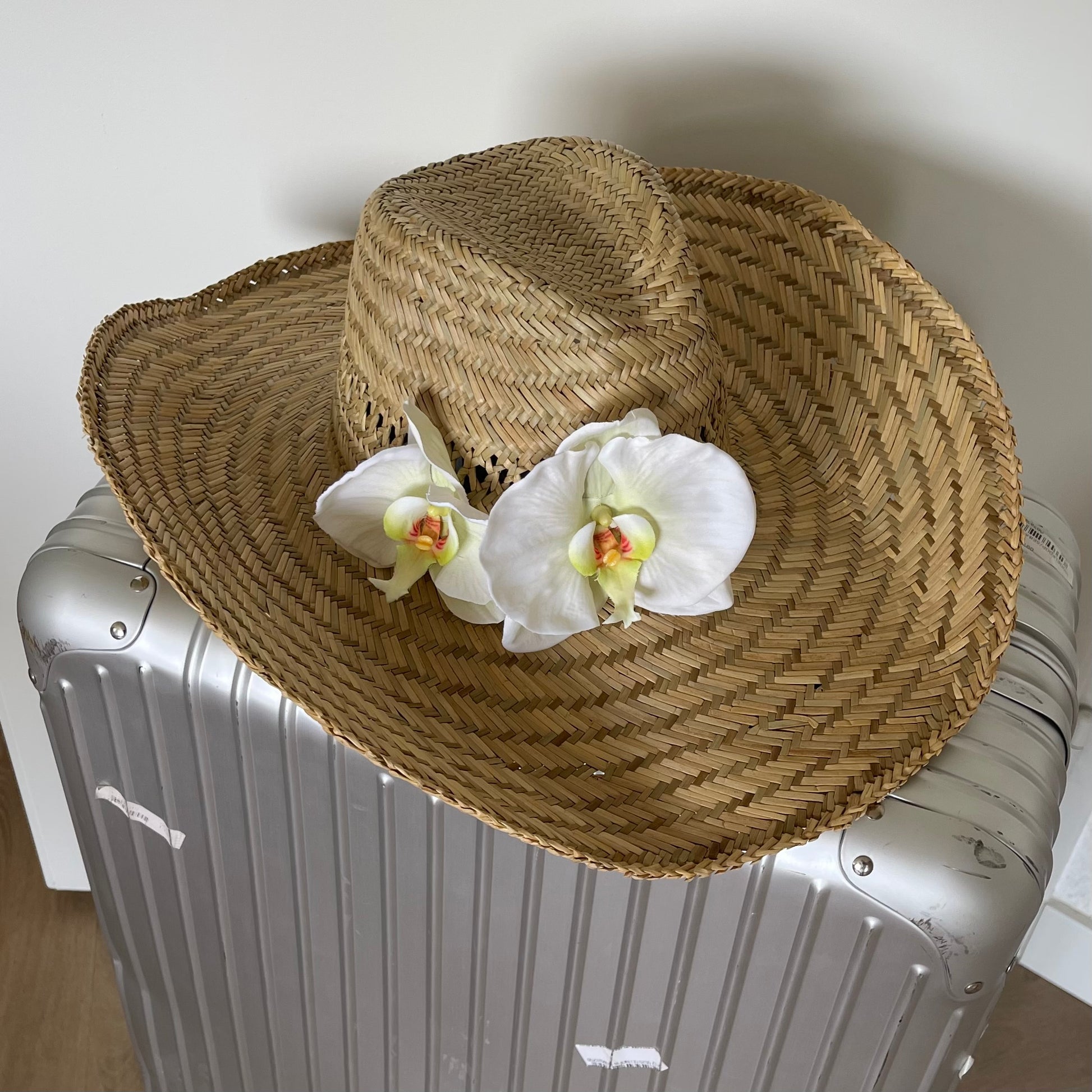 Aan de voorkant en rechterzijde van de hoed zijn twee witte zijden orchidee bloemen met de hand vastgezet