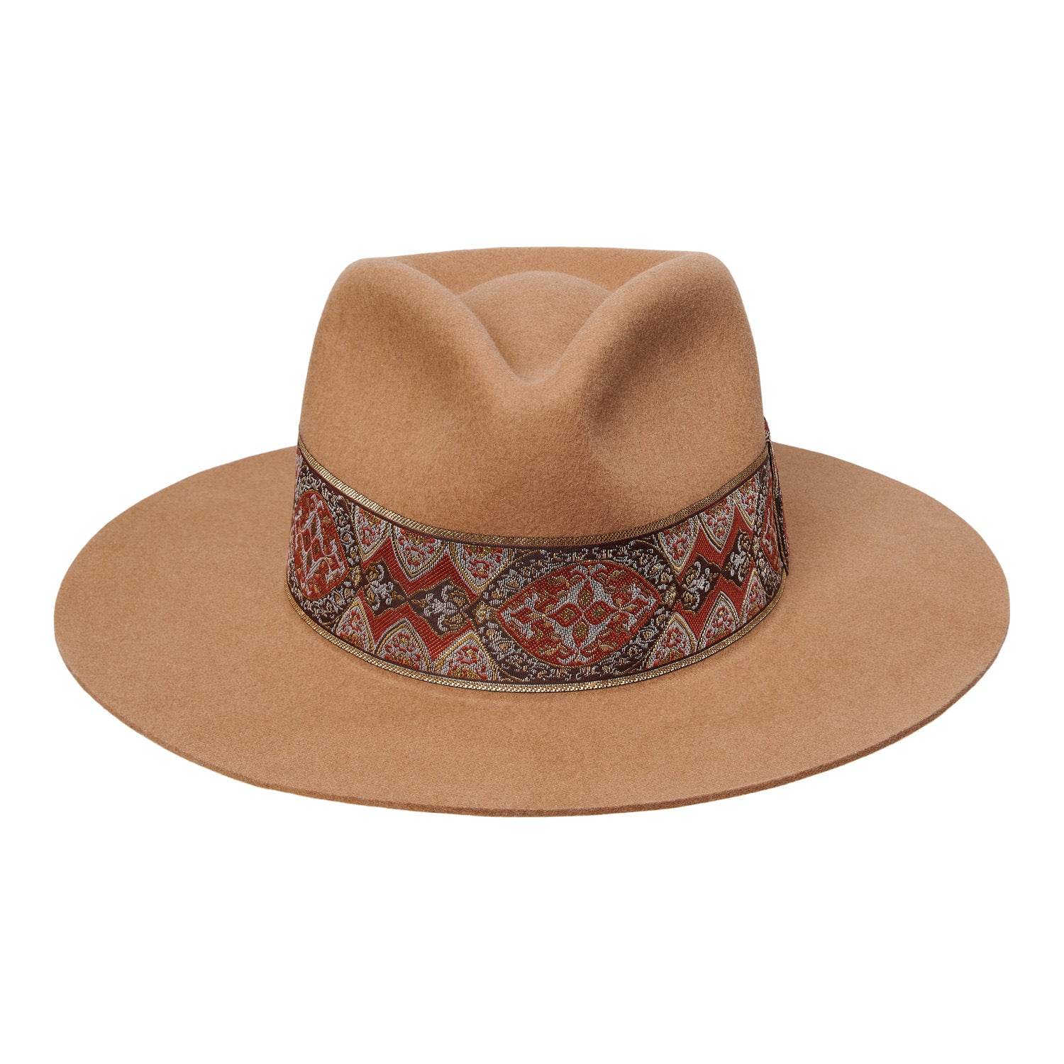 Een unieke en stijlvolle fedora hoed gemaakt van bruin wolvilt en versierd met een handgemaakte hoed band van kleurrijk jacquard lint. Deze bruine Jacquard Cinnamon fedora hoed is ideaal voor alle gelegenheden en kan goed gecombineerd worden met elke outfit. De Exclusive Jacquard lijn geeft een speelse twist aan het klassieke fedora model.