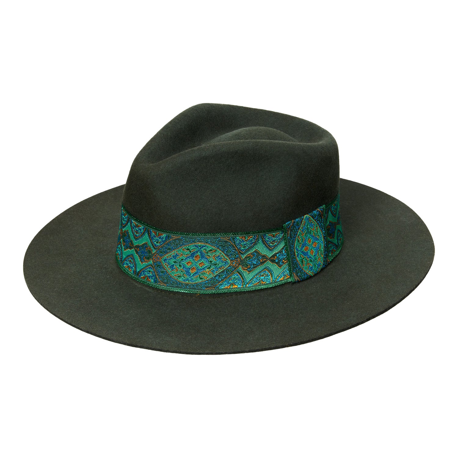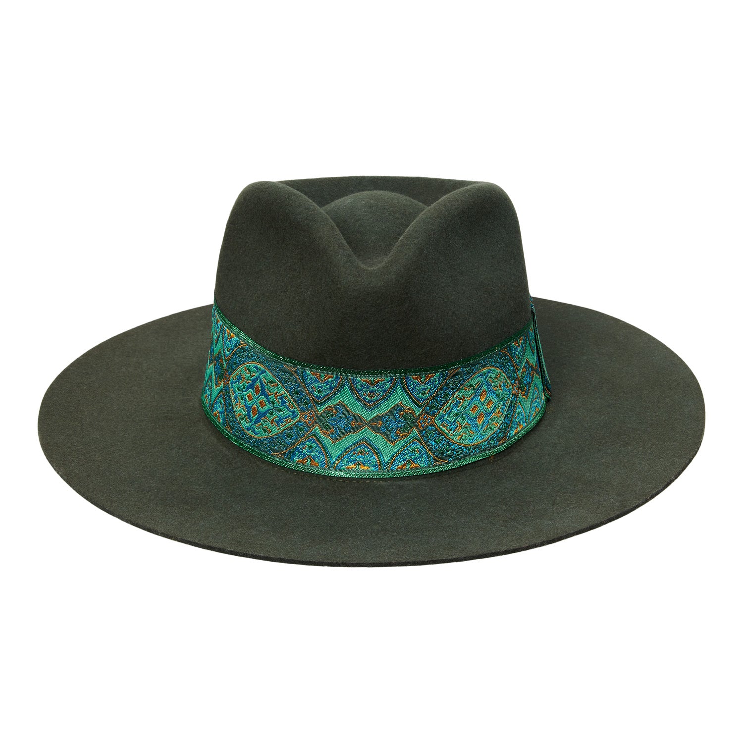 Een unieke en stijlvolle fedora hoed gemaakt van donkergroen wolvilt en versierd met een handgemaakte hoed band van kleurrijk jacquard lint. Deze donkergroene Jacquard Emerald fedora hoed is ideaal voor alle gelegenheden en kan goed gecombineerd worden met elke outfit. De Exclusive Jacquard lijn geeft een speelse twist aan het klassieke fedora model.